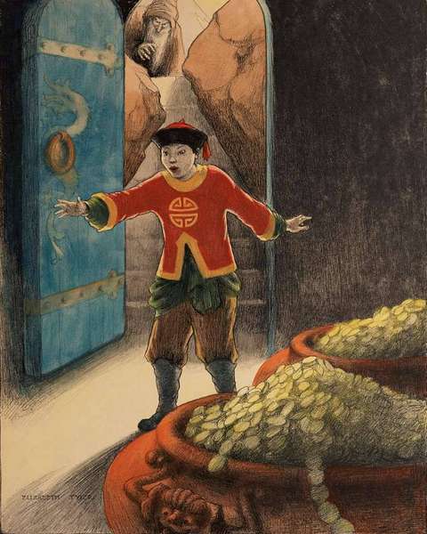 The Big Book of Fairy Tales was edited by Walter Jerrold and first published by Blackie & Son, London, Glasgow, Bombay, 1911. Aladdin or the Wonderful Lamp is one of 30 fairy tales and this illustration is just one of 34 color images in the book.